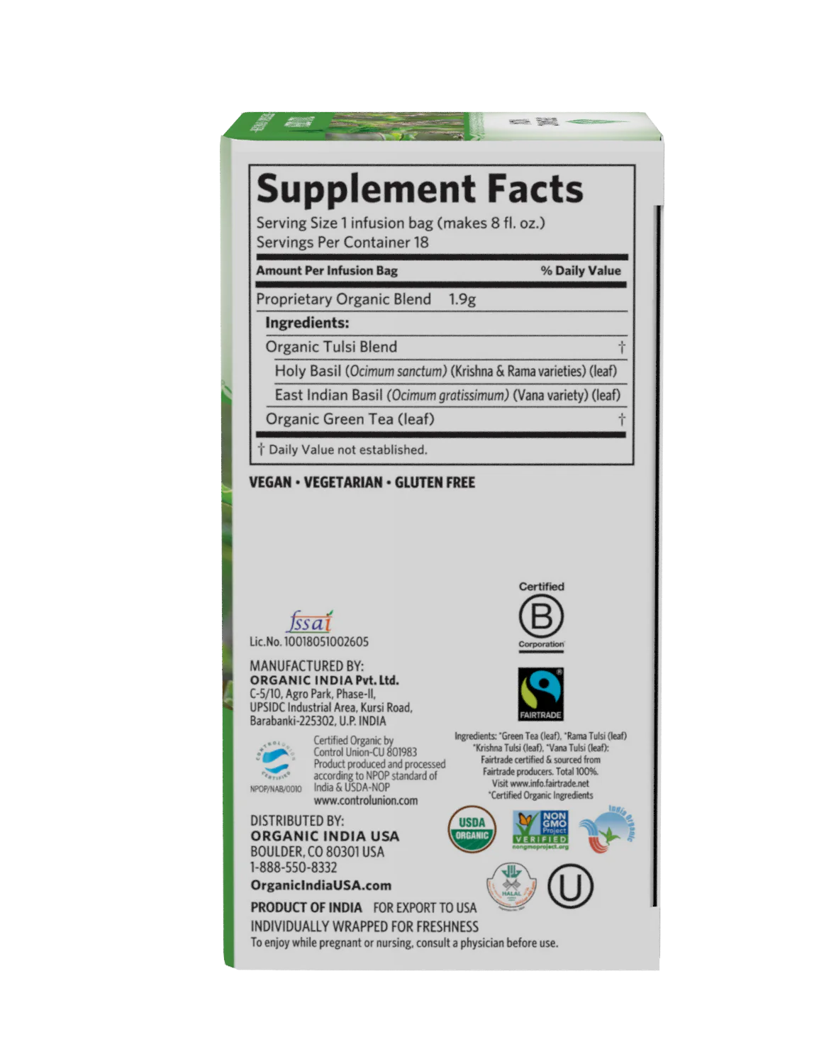 Enjoy a natural burst of energy with the adaptogen Tulsi, also known as Holy Basil, and the antioxidant powerhouse Green Tea. ORGANIC INDIA's Tulsi Green Tea blend has just enough caffeine to give you a boost, while simultaneously relieving stress for lasting energy. Fairtrade and Organic, this tea can very well become your go-to beverage for focus, mental clarity and mind-body-spirit balance.