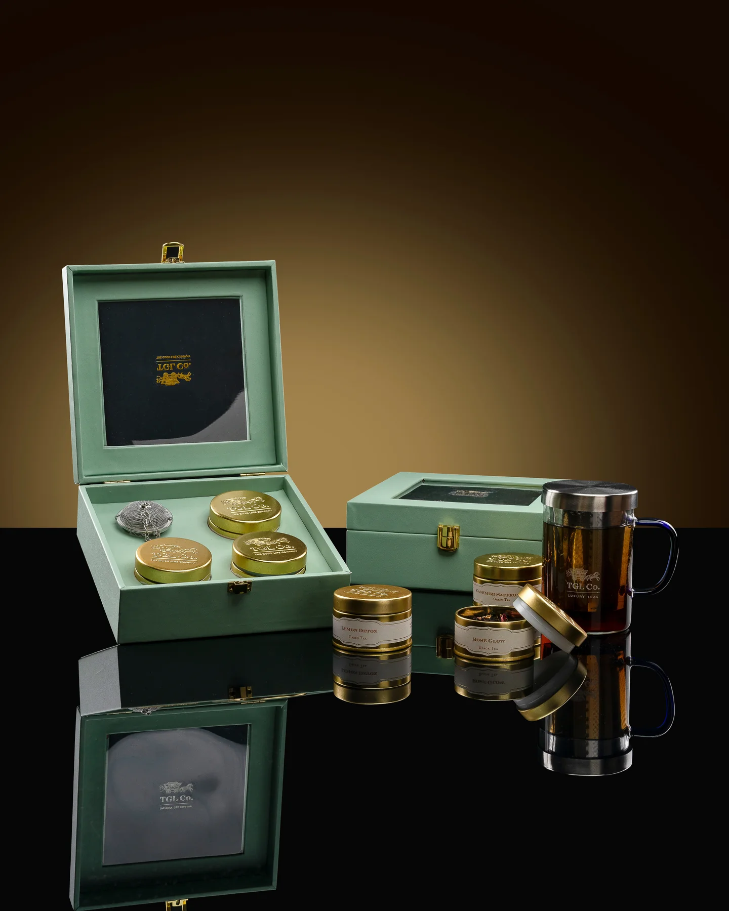 gold buckle that unlocks three blends packed in luxe gold tin caddies. There’s a strainer in too, to brew the perfect pick-me-up beverage.