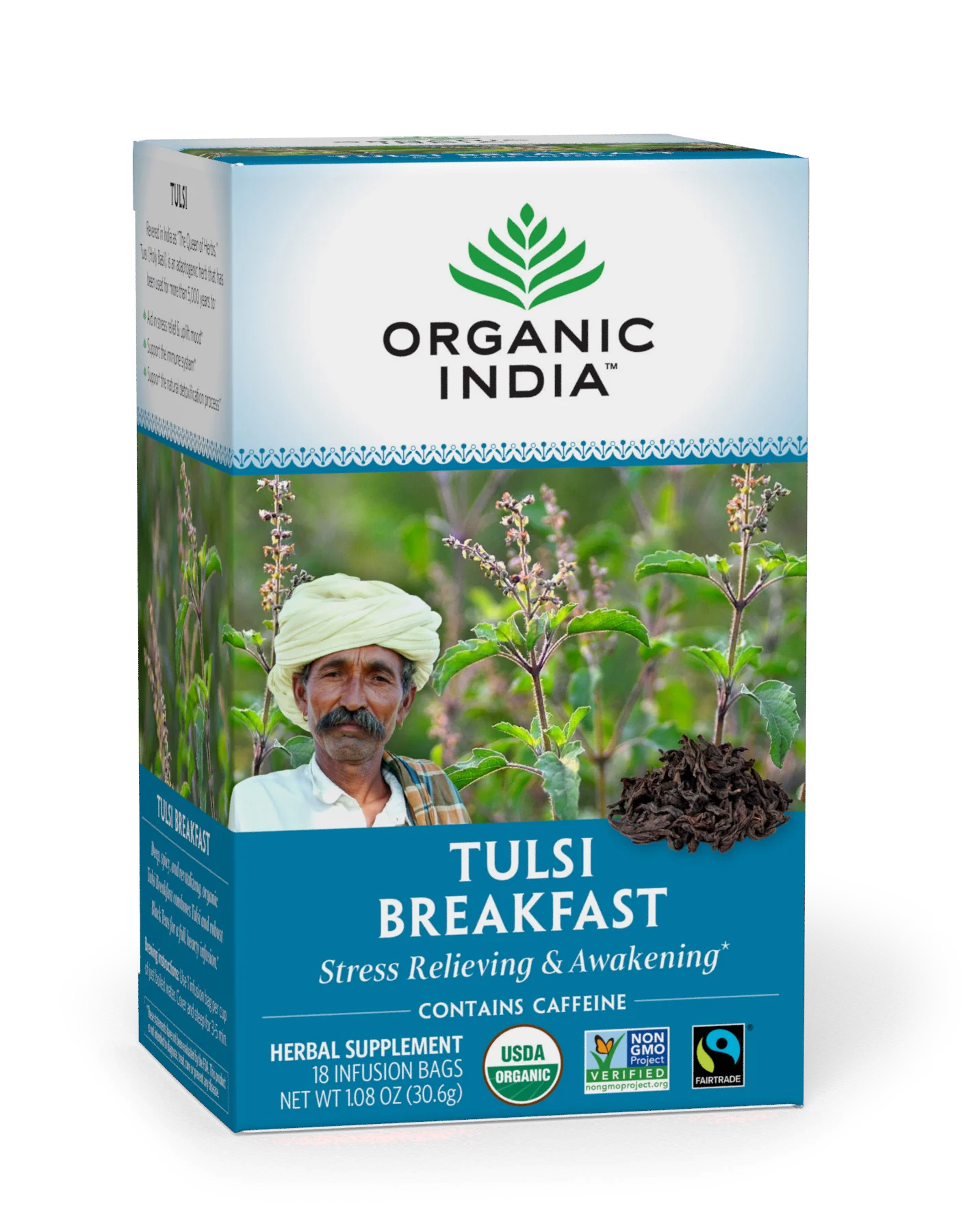 Tulsi Breakfast Tea is the perfect way to start the day. Organic, Fairtrade Tulsi and high-quality iconic Assam Black Tea make for a balancing lift, rather than the intense jolt associated with coffee. Instead, Tulsi, or Holy Basil, has a relaxing effect on the nervous system, which balances the Black Tea for sustained energy, keeping you focused and refreshed. Enjoy on its own or with your favorite creamer and low-glycemic sweetener for a unique morning ritual that mixes the stress-relieving power of adaptogens and the stimulating action of caffeine. The best of both worlds!