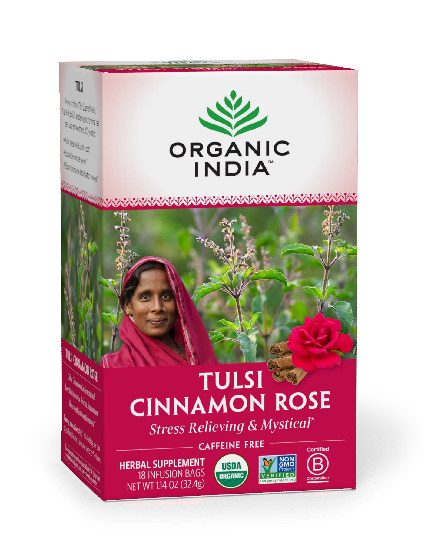 ORGANIC INDIA's foundational herb, Tulsi, meets organic Ceylon Cinnamon and soothing Rose for a floral and invigorating infusion. Harvested from the bark of evergreen trees, Ceylon Cinnamon is a superfood that boasts antioxidant and blood sugar-supporting properties, while Tulsi is a potent adaptogen that helps relieve stress. Aromatic rose petals add a touch of softness that support heart health and bring this tea to life. Brew a cup of Tulsi Cinnamon Rose Tea for a cozy, warming beverage that's perfect for any winter occasion.