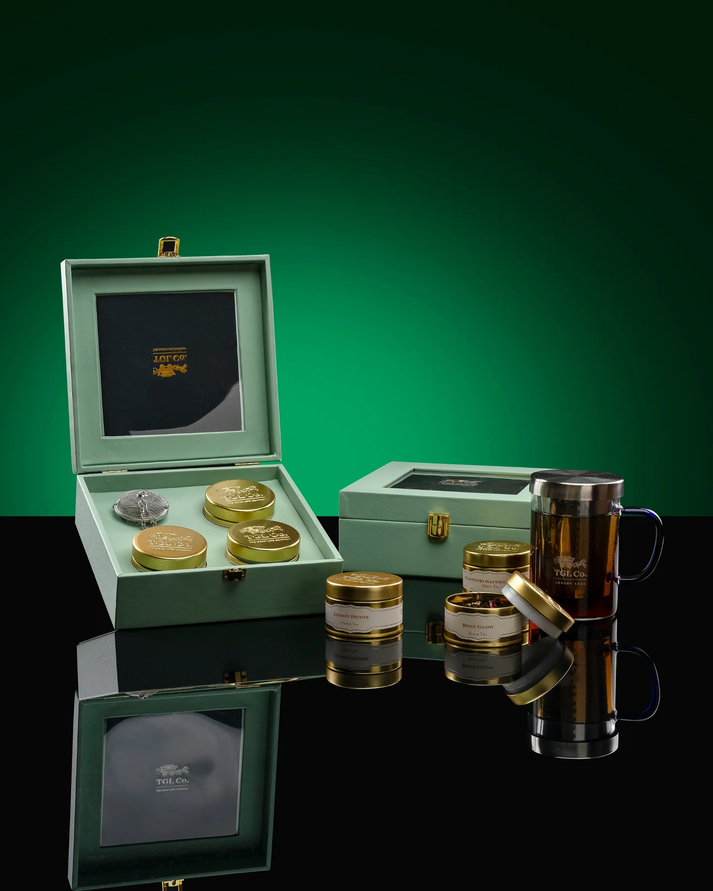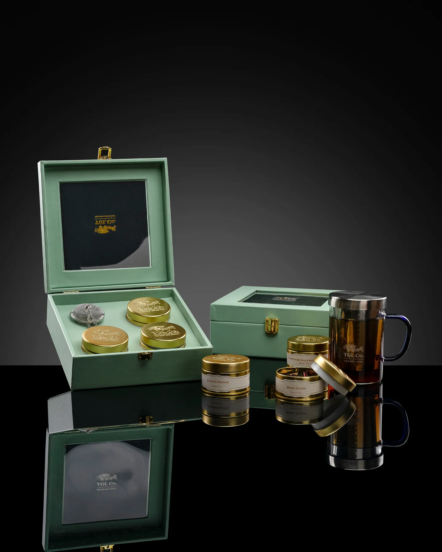 gold buckle that unlocks three blends packed in luxe gold tin caddies. There’s a strainer in too, to brew the perfect pick-me-up beverage.