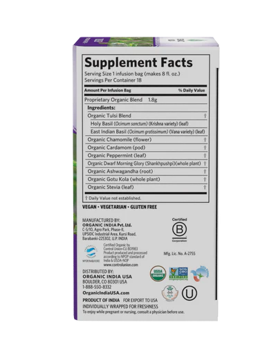 Delight in this dreamy blend of Tulsi, Ashwagandha and Chamomile for deep relaxation and restful sleep. Tulsi and Ashwagandha are both adaptogens that synergistically work together to release stress from the body and mind. Chamomile is a go-to herb for calm and comfort. This organic and delicious Tulsi Sleep Tea will tuck you in before you even hit the sheets.